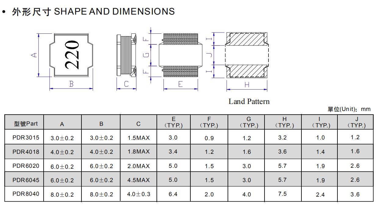 如下圖所示:PDR系列貼片屏蔽電感和GNR系列貼片屏蔽電感的外形尺寸幾乎沒有差別,谷景電子的GNR系列貼片屏蔽電感不僅囊括了風華高科PDR系列的5種型號,還有12種型號可以供客戶選擇,如果這些還不能滿足客戶的要求,谷景還可以提供定制服務。